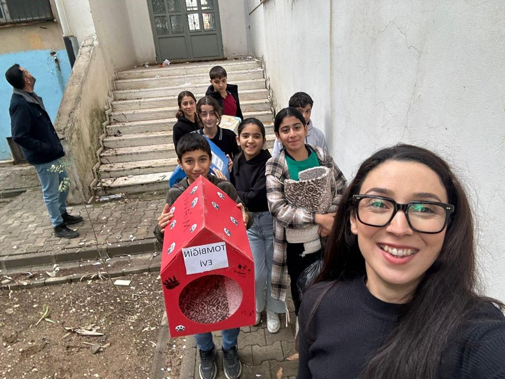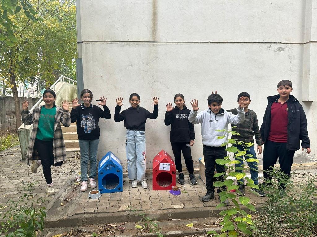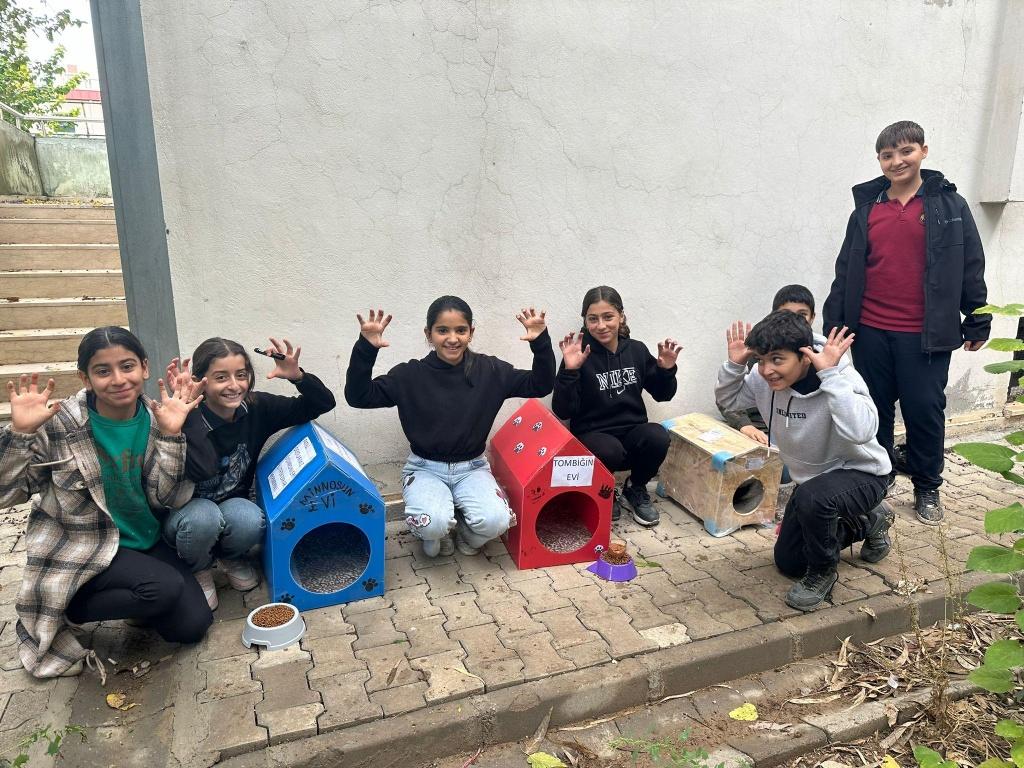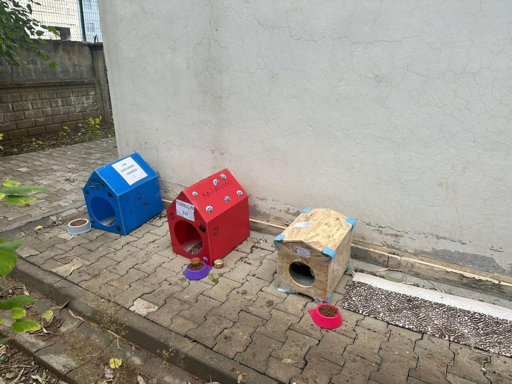Öğrencilerimizle okulumuzda bulunan kediler için yaptığımız kedi evlerini okul bahçemize ekledik.